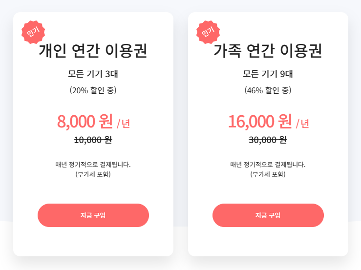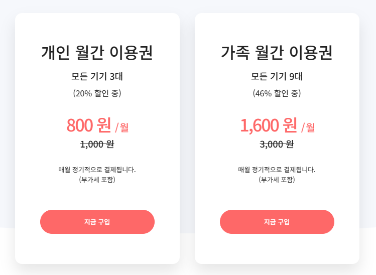 개인 월간 이용권 및 가족 월간 이용권으로 나누어져 사용이 가능합니다.