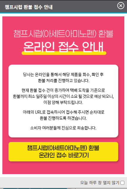 챔프가 박스가 없는 제품도 환불이 가능하다고 하니, 일단 집에있는 챔프를 모아서 어서 빨리 환불 처리 하시면 됩니다. 가까운 약국에서 환불이 가능하지만, 온라인으로도 신청이 가능합니다. 소아과에 있는 약국 두 곳에서 챔프 환불은 온라인으로 신청하라고만 안내해주셔서, 집에 와서 부랴부랴 다시 신청하게되었습니다.